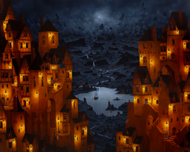 Le Voyage Extraordinaire est sans doute l’une de mes œuvres les plus marquantes. D’abord parce que c’est la plus grande que j’ai jamais réalisée. Elle m’a permis d’intégrer des clins d’œil : à Jules Verne bien sûr, pour l’idée du voyage, à Disney, à Banksy. Cette toile était idéale pour cela, car son format donnait la place pour insérer ces références discrètes. Mais l’essentiel reste le paysage, qui occupe les deux tiers du temps de travail. Les villes, même si elles changent, finissent par se ressembler. Les paysages, eux, sont toujours différents, toujours inventés. Dans ce tableau, on trouve par exemple un bout de mer perdu au fond d’une vallée, un phare, une crique, deux rivières qui descendent. C’est une composition classique, mais qui me permet de créer un monde original. Je m’inspire des premiers peintres de paysages, les flamands principalement, qui voulaient représenter le monde entier dans une toile. Albrecht Altdorfer, par exemple, dans La bataille d’Alexandre : il peint des milliers de soldats, mais à l’arrière-plan, il représente toute la Méditerranée, la Grèce, la Terre Sainte, les îles, le Nil et la Mer Rouge. La bataille n’est qu’un prétexte pour peindre un paysage. À l’époque de Copernic, on découvrait que la Terre n’était plus le centre du monde mais une planète parmi d’autres. Dans ce monde soudain devenu infini, sans doute les peintres voulaient alors recréer une Terre miniature rassurante visible en un seul coup d'œil dans leurs œuvres. Car comme disait Pascal “ Le silence éternel des espaces infinis m’éffraie” Moi aussi, j’aime cette idée de condenser le monde dans un tableau.