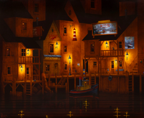 Je peins à l’huile, exclusivement. C’est le medium qui me permet d’obtenir le résultat le plus juste pour mon art. Pour les couleurs, je privilégie les scènes de nuit. Beaucoup de peintres, ou même le cinéma, utilisent le bleu pour traduire la nuit. Mais moi, je préfère garder des gammes chaudes. Les zones sombres peuvent être bleues ou noires, mais mes dégradés restent dans les tons chauds. Pourquoi ? Parce que si j’utilisais le bleu, on aurait l’impression que la lumière vient de la lune. Or mes villes sont éclairées par des lumières artificielles. J’aime ce contraste entre la chaleur de la ville et la profondeur sombre de la nuit.